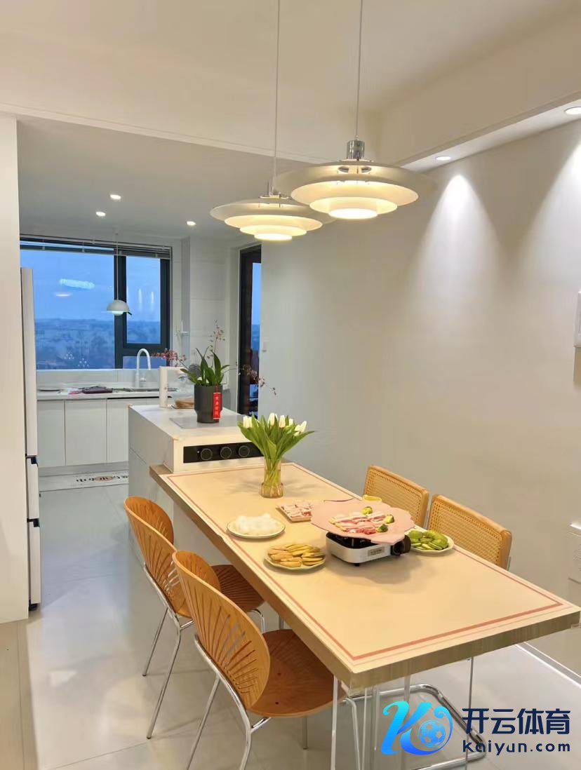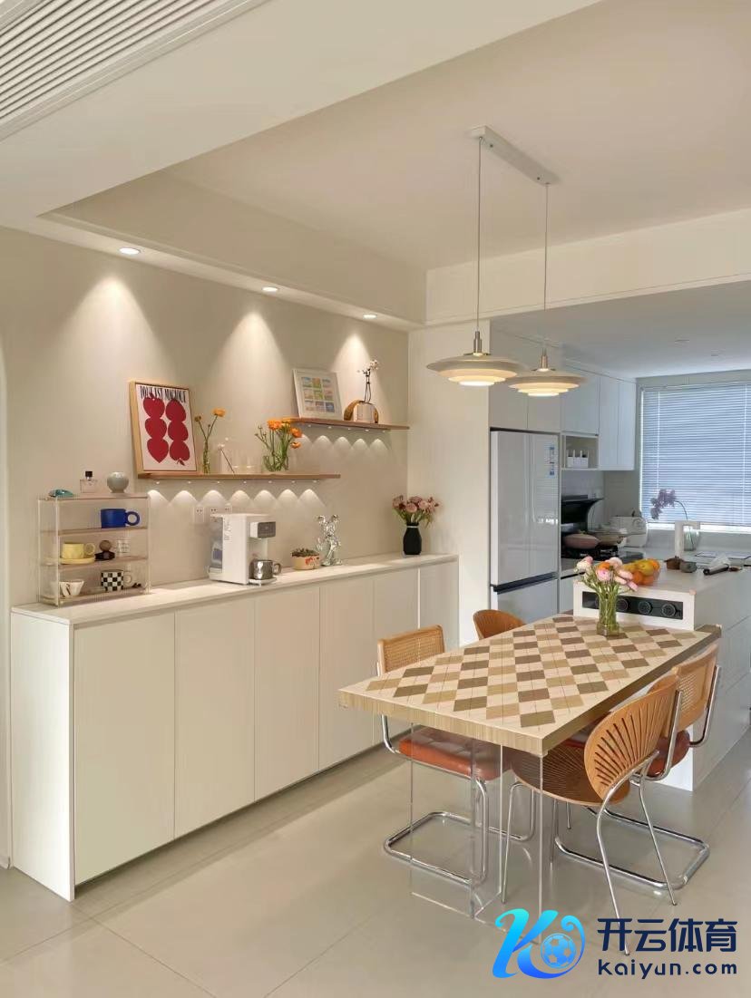 厨房进犯掀开,作念成敞开式厨房,岛桌和餐桌情投意合,让你既能职责,又能吃饭。半高的餐具柜+搁板在闲适储物的同期增多了筹办感。