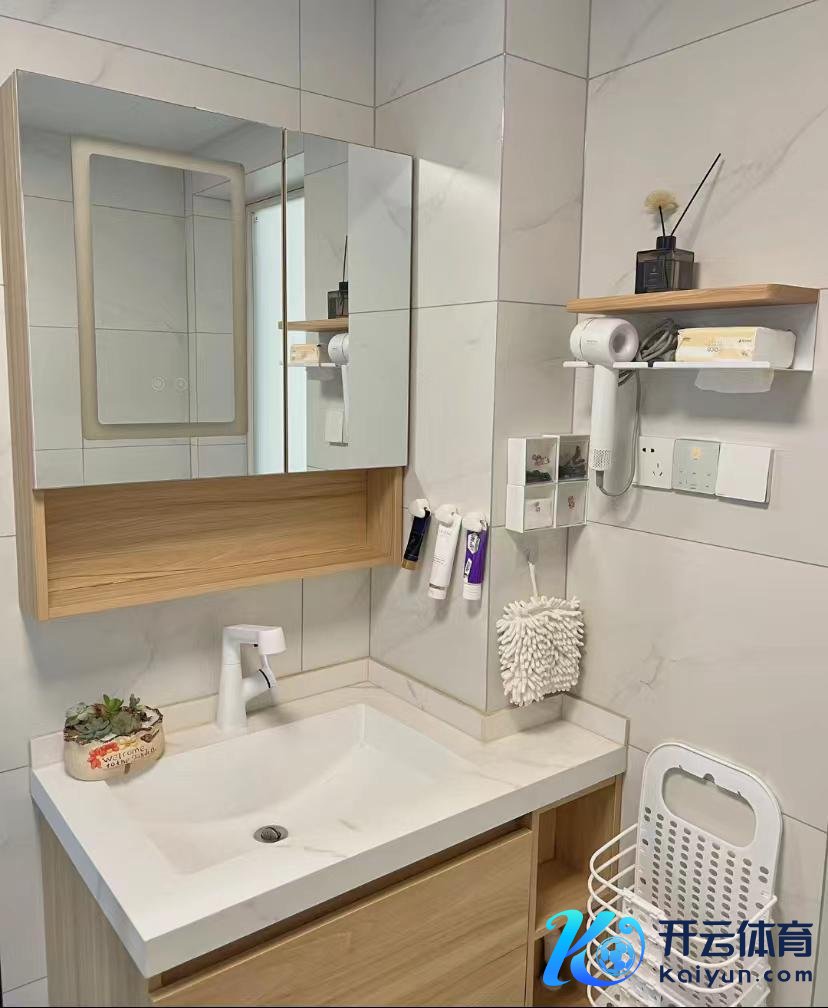 原木色的镜柜增多了浴室的收纳功能,不错在一定经过上缓解小台面上莫得场合放日用品的弱势。